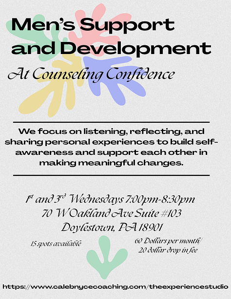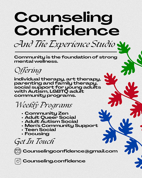 Counseling Confidence offers therapy for individuals, families, and couples from experienced therapists. We each take insurance and will work with you to make it affordable. The Experience Studio is our programming, which ranges from mindfulness, meditation, and stress reduction to social groups for autistic adults, for our local queer community, and men.