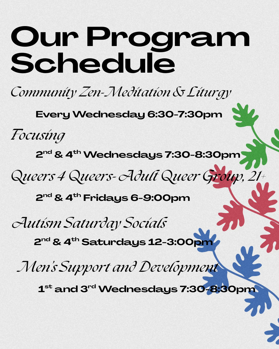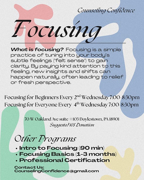 Welcome back… or rather, thanks for welcoming us back. As you can see, we’ve got some programs going on. All are very affordable. In this newsletter we will be highlighting some of the work we do and discussing the mental health practices we teach and use in our personal lives. Please see below for posters of some of the programs. Course announcements for Focusing Psychology, Buddhist Psychology, Parenting, and Parenting the Spectrum as well as a younger teen group are on the way.